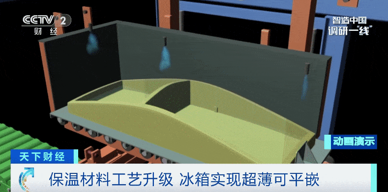 預裝完成后,車間里的裝備會將保溫材料填充進冰箱外殼與內膽之間的腔體。保溫材料就像一層“羽絨服”,能夠隔絕冰箱內外的熱量交換,讓冰箱內部始終保持低溫。過去,保溫材料用的是聚氨酯泡沫,需要填充比較厚的一層,才能達到理想的保溫效果。如今,技術進步,讓填充層的厚度減少到3至4厘米,相當于給冰箱穿上一件更加輕薄、保暖效果出色的“羽絨服”。如今,市面上出現了很多整體厚度不到60厘米,能夠完美嵌入家用櫥柜的冰箱,正是得益于這項生產技術的進步。